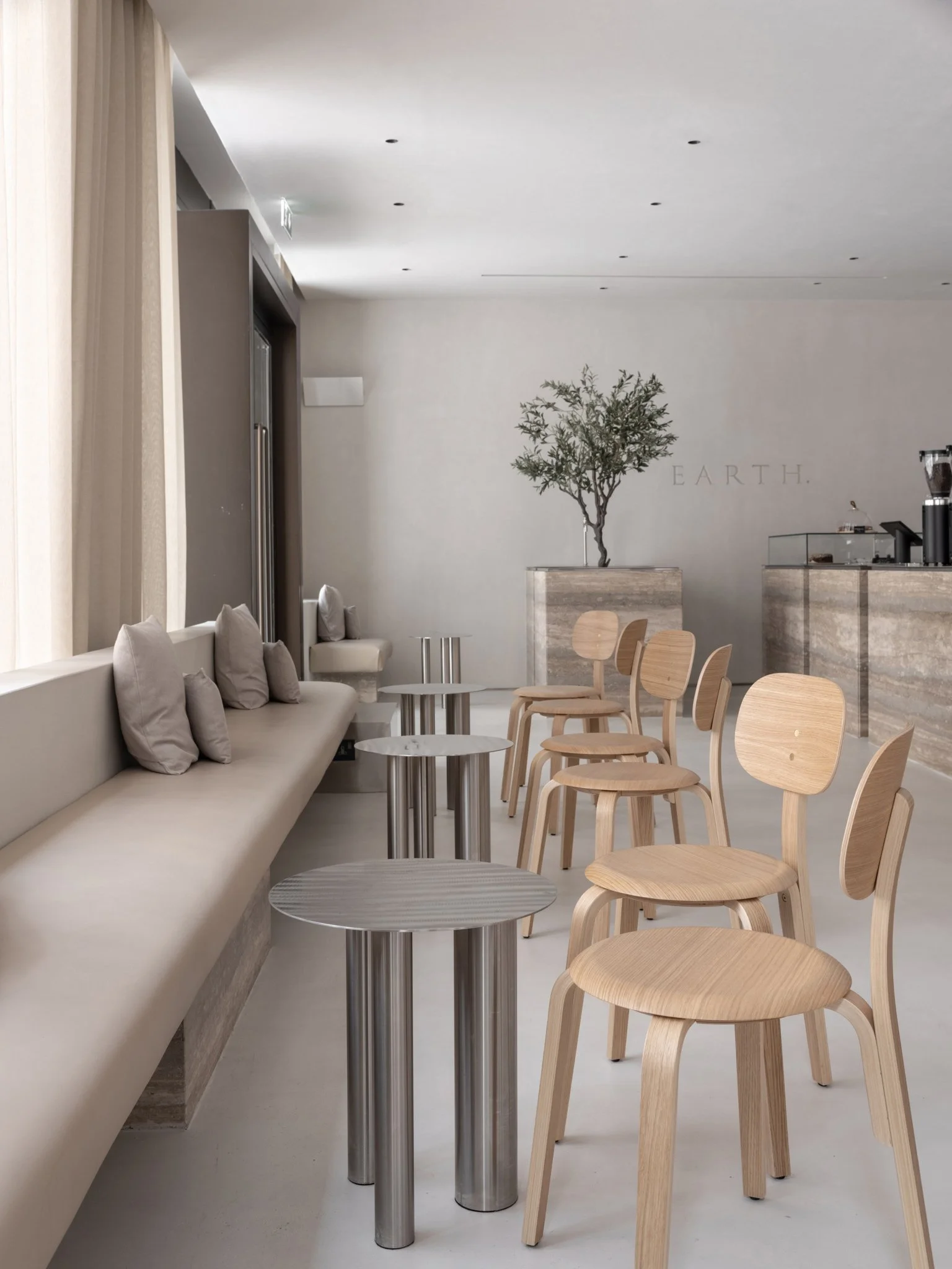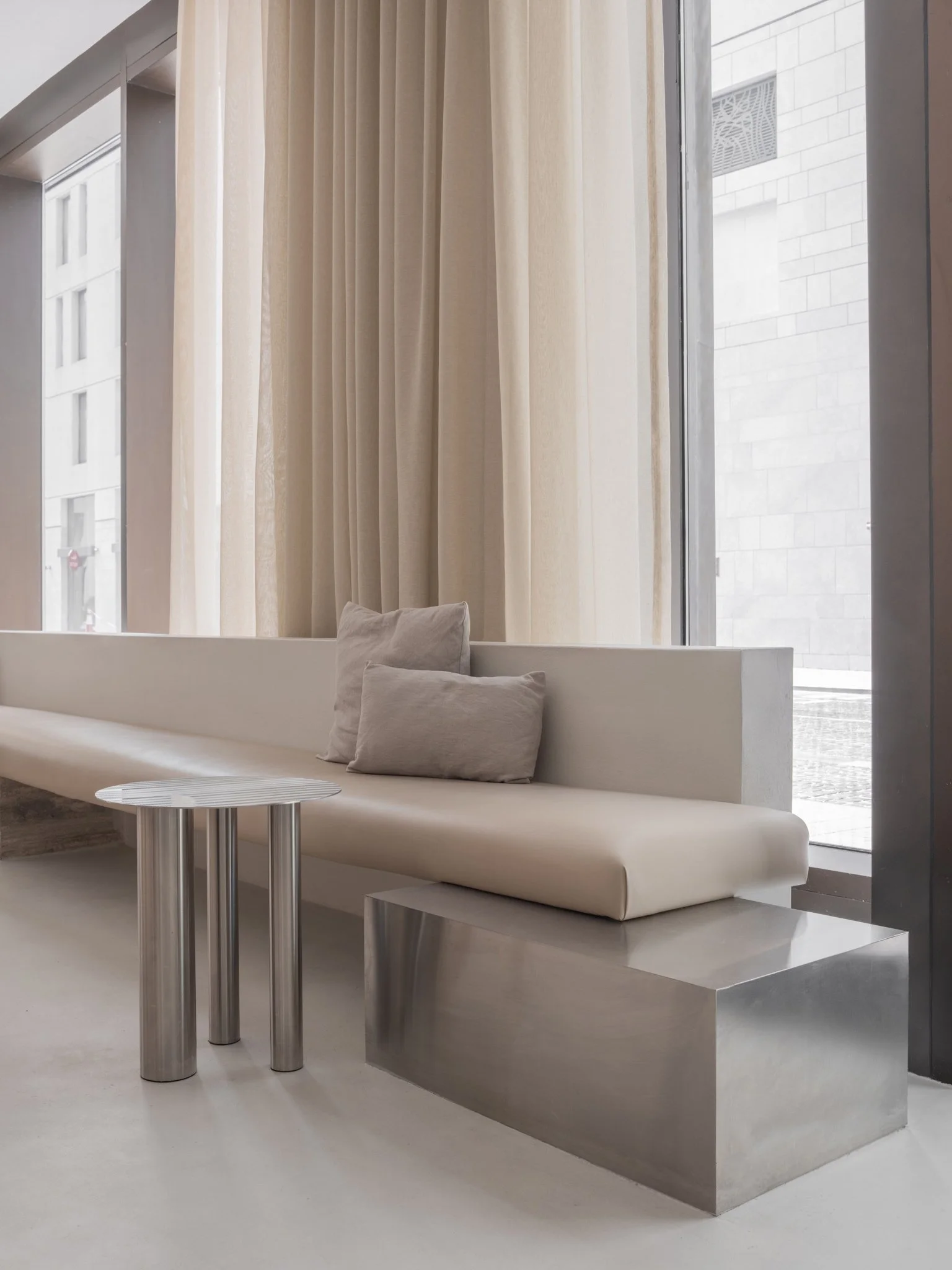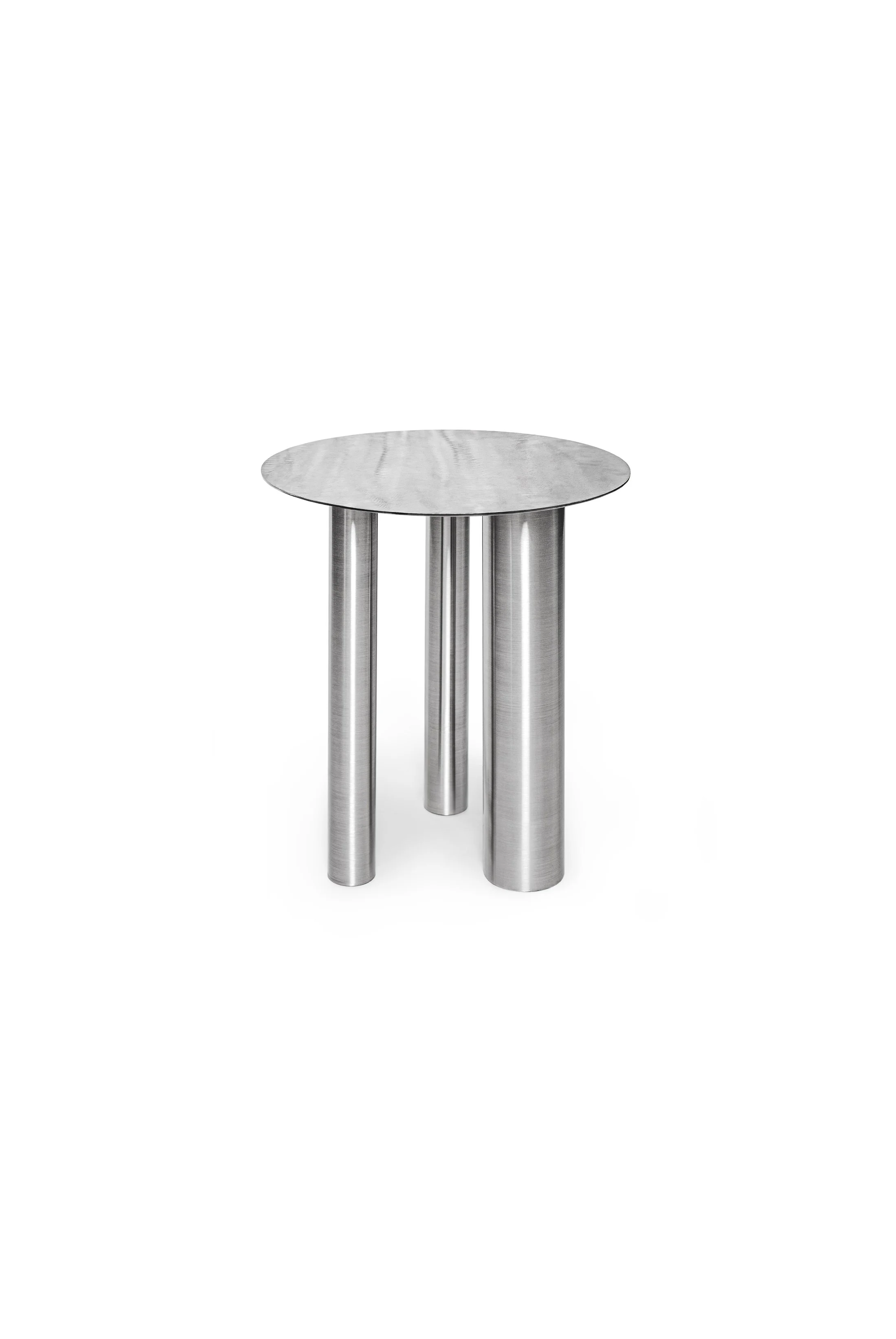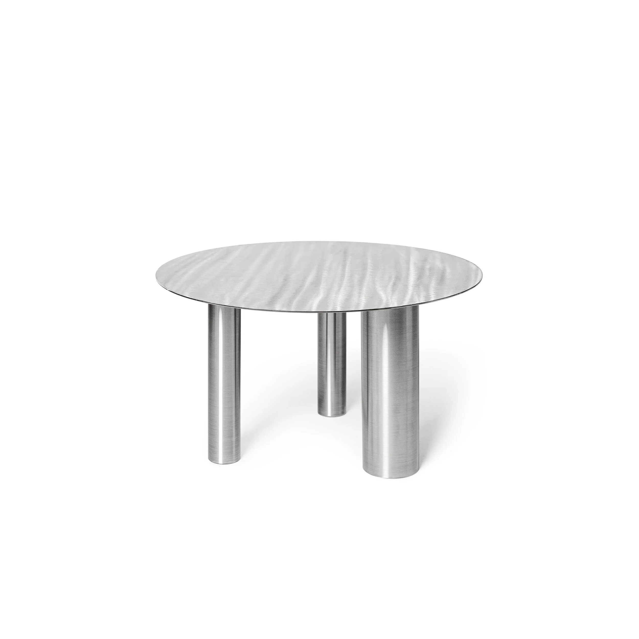 Inspired by the Bauhaus movement, the Brandt Coffee Table CS1 embodies modern sophistication by seamlessly combining form, material, and texture in a striking design. It is entirely crafted from stainless steel and features a sleek tabletop supported by three cylindrical legs of varying diameters, creating a balanced asymmetry. The hand-brushed surface resembles the ripples of water, making each piece a functional work of art.