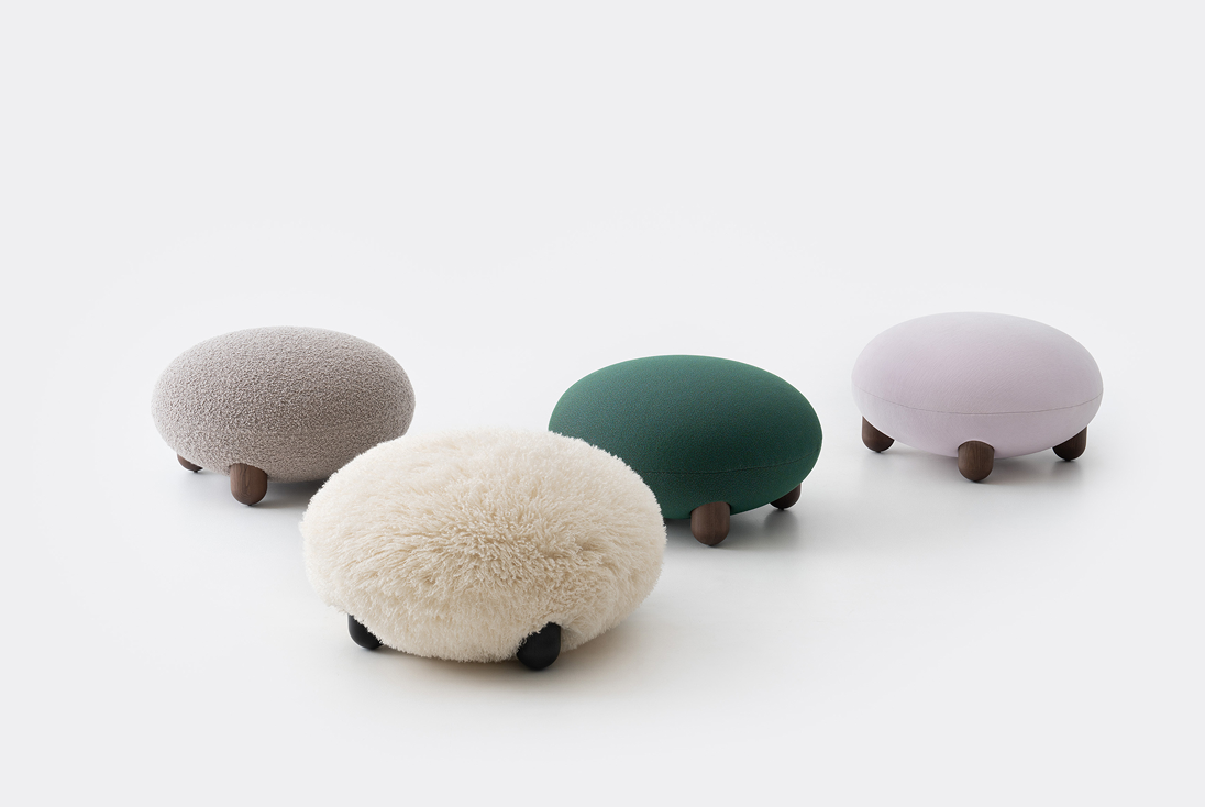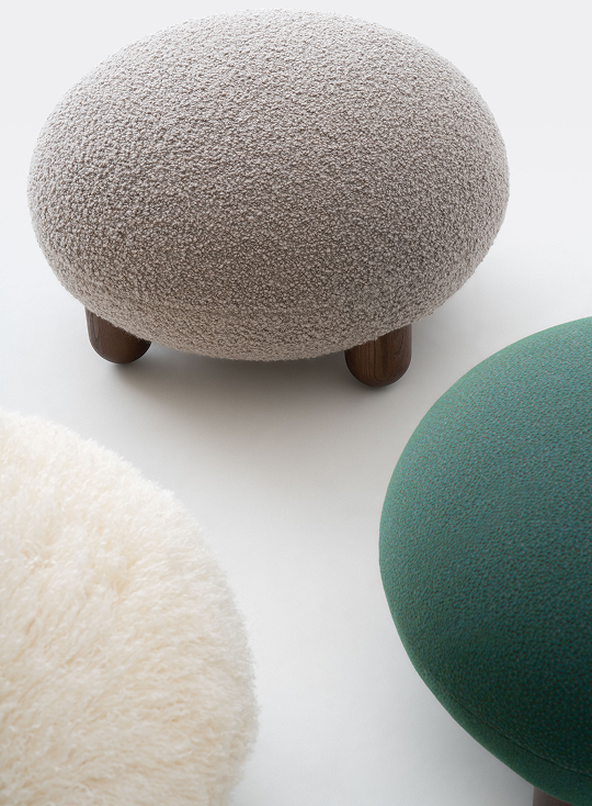 Flock lounge chairs and ottomans can be customised in a wide range of textile options with wooden legs in natural hues or painted in any RAL colour.