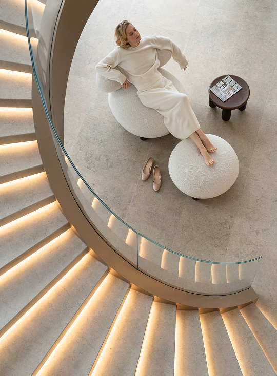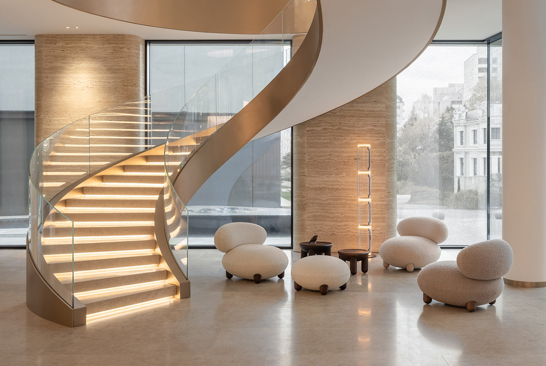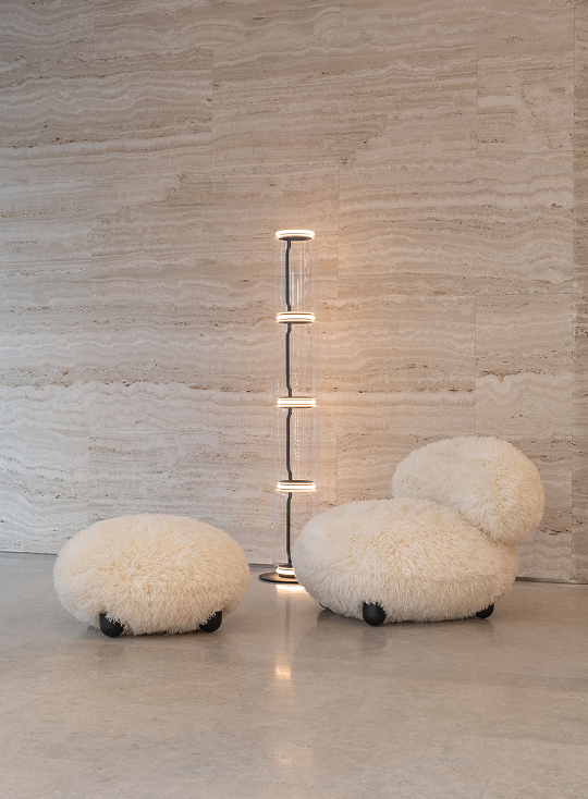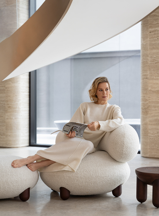 The name "Flock" reflects its role as a tranquil oasis and central meeting space within the home, where soft, voluptuous forms, natural materials, and pleasing tactile surfaces create an ambiance of warmth and cocooning.
